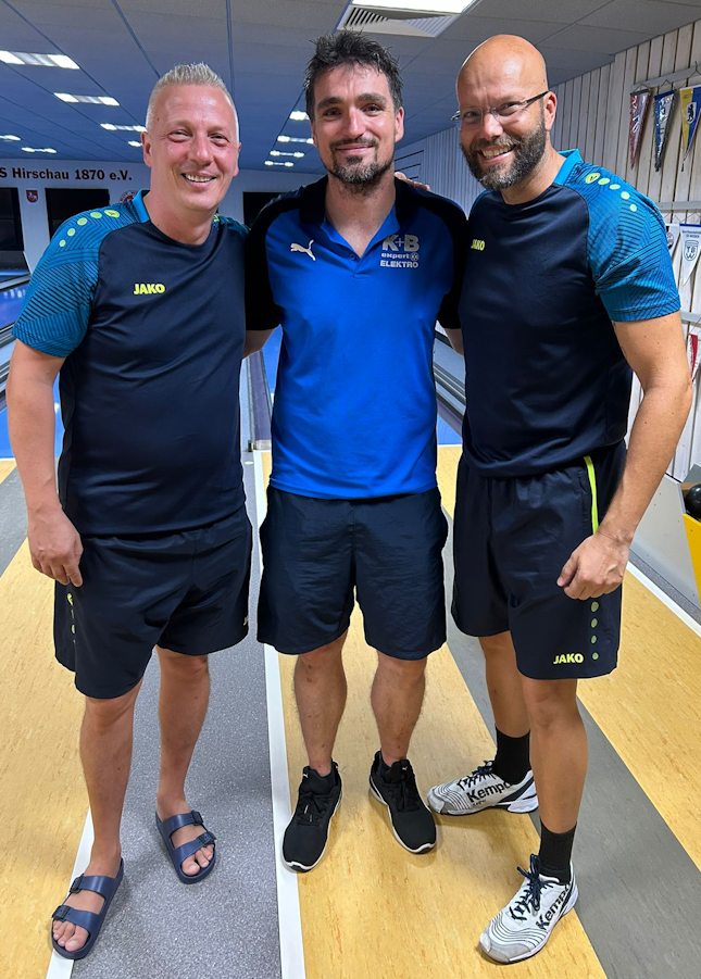 Stolz wie Bolle: Mike Lauserdorf und Nico Günther mit einem der besten Kegler Deutschlands: Jürgen Pointinger (Mitte)